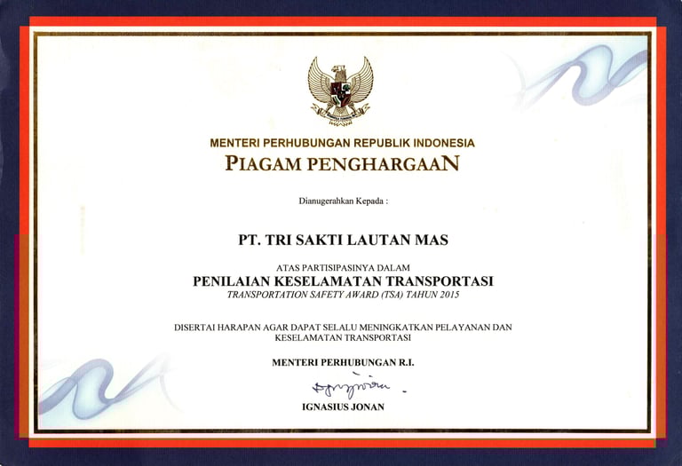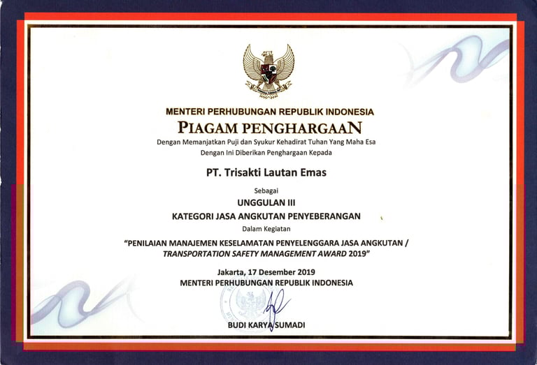 Unggulan III (Ketiga) Kategori Jasa Angkutan Penyeberangan dalam kegiatan Penilaian Manajemen Keselamatan Penyelenggara Jasa Angkutan / Transportation Safety Management Award (TSMA) Tahun 2019 yang diberikan oleh Menteri Perhubungan.