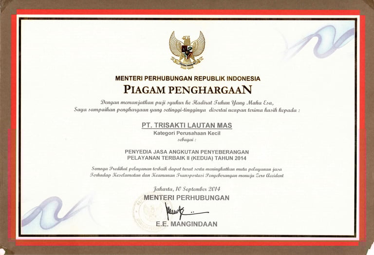 Perusahaan Penyedia Jasa Angkutan Penyeberangan Pelayanan Terbaik II (Kedua) Tahun 2014 yang diberikan oleh Kementerian Perhubungan Direktorat Jenderal Perhubungan.