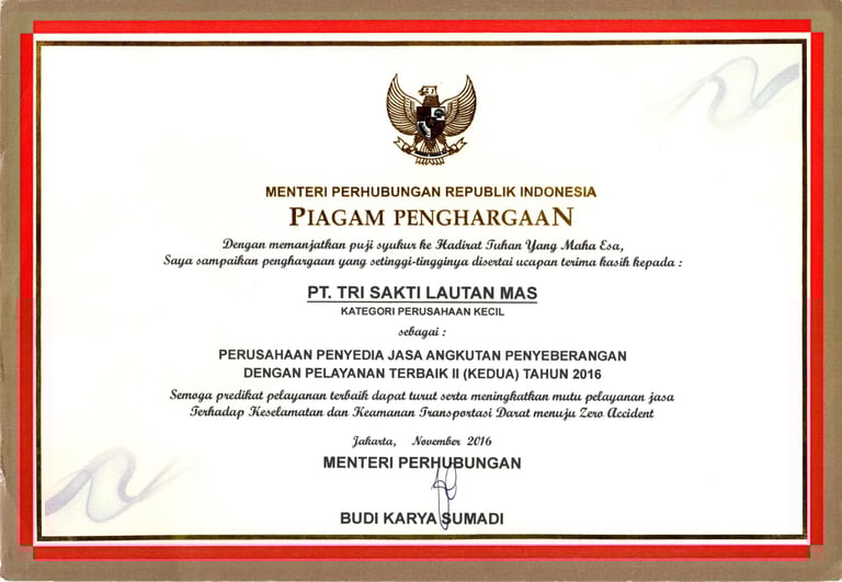 Perusahaan Penyedia Jasa Angkutan Penyeberangan Pelayanan Terbaik II (Kedua) Tahun 2016 yang diberikan oleh Menteri Perhubungan.